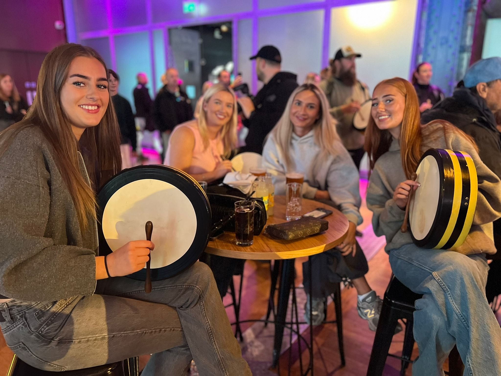 Because you don’t need any musical experience to play the bodhrán. Within minutes, the group is creating a shared pulse. Within half an hour, they’re playing layered rhythms together. By the end, they’re performing as a fully connected percussion ensemble.